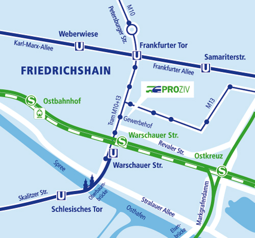 Unser Büro befindet sich im Zentrum Berlins, an der Nahtstelle zwischen Ost und West im Bezirk Friedrichshain-Kreuzberg. Man erreicht uns mit öffentlichen Verkehrsmitteln am besten mit S+U-Bahn, Bahnhof „Warschauer Straße” und 150 m Fußweg in Richtung Frankfurter Tor sowie mit mehreren Tram-Linien, Haltestelle „Warschauer Straße”.